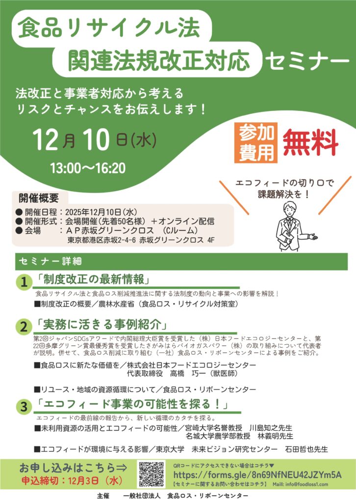 こうした制度改正の動きを踏まえ、本セミナーでは「 制度改正の最新情報  」や「 実務に活きる事例紹介  」、「エコフィード事業の可能性を探る!」と題したテーマからわかりやすく整理し、法改正と事業者対応から考えるリスクとチャンスをお伝えします。