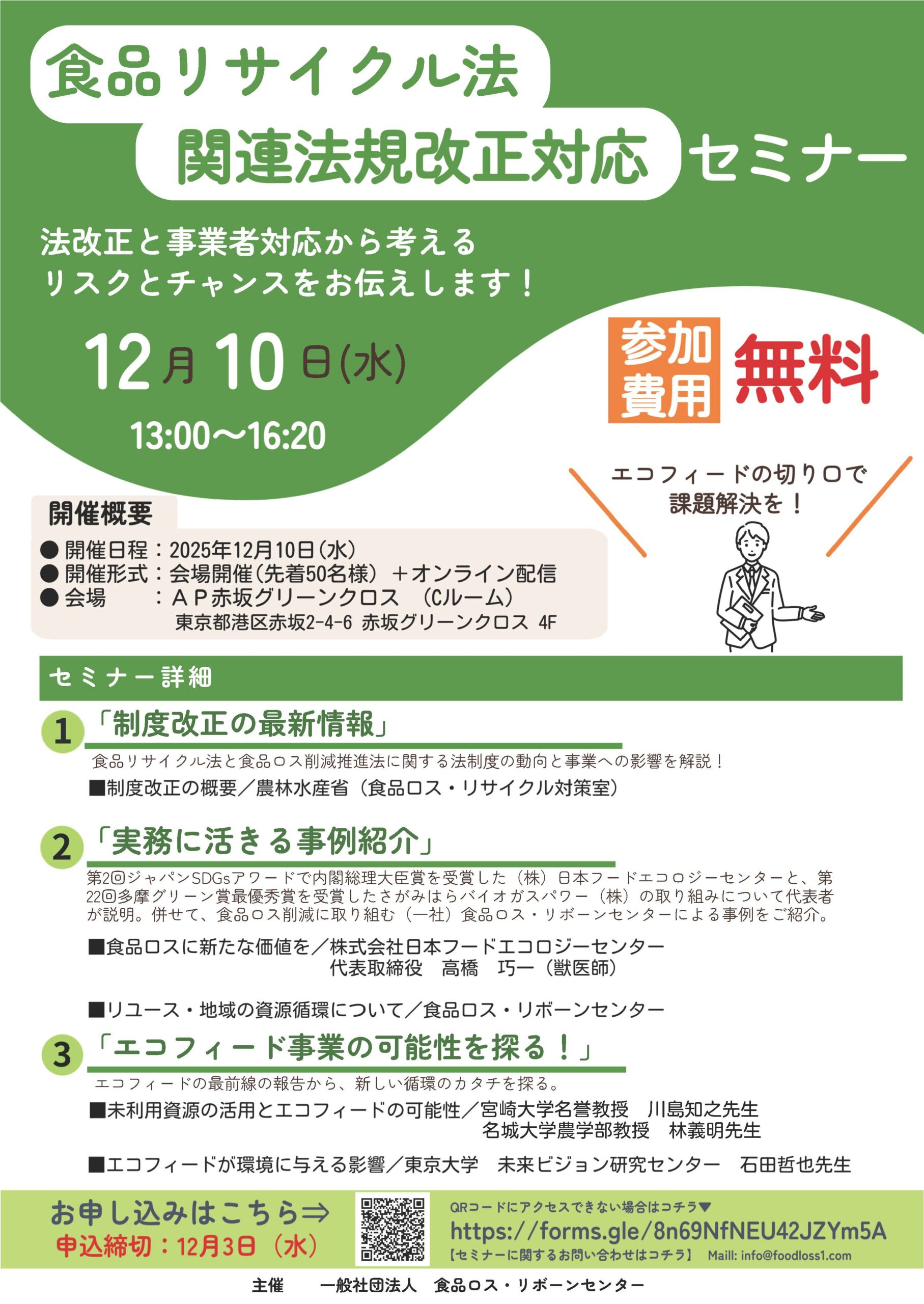 こうした制度改正の動きを踏まえ、本セミナーでは「 制度改正の最新情報  」や「 実務に活きる事例紹介  」、「エコフィード事業の可能性を探る!」と題したテーマからわかりやすく整理し、法改正と事業者対応から考えるリスクとチャンスをお伝えします。